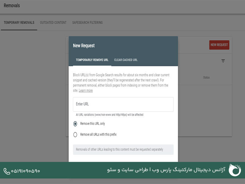 این بخش به شما امکان میدهد یک URL خاص را برای مدت حداکثر 6 ماه از نتایج گوگل حذف کنید.