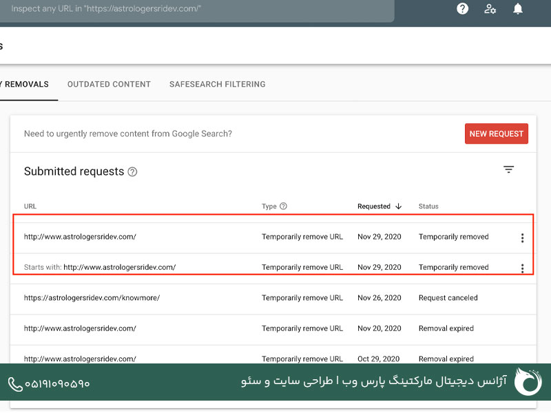 این ابزار تنها بهصورت موقت عمل میکند. اگر میخواهید صفحهای بهطور کامل حذف شود، باید آن را از سایت پاک کنید یا با تگ noindex جلوی ایندکس شدنش را بگیرید.